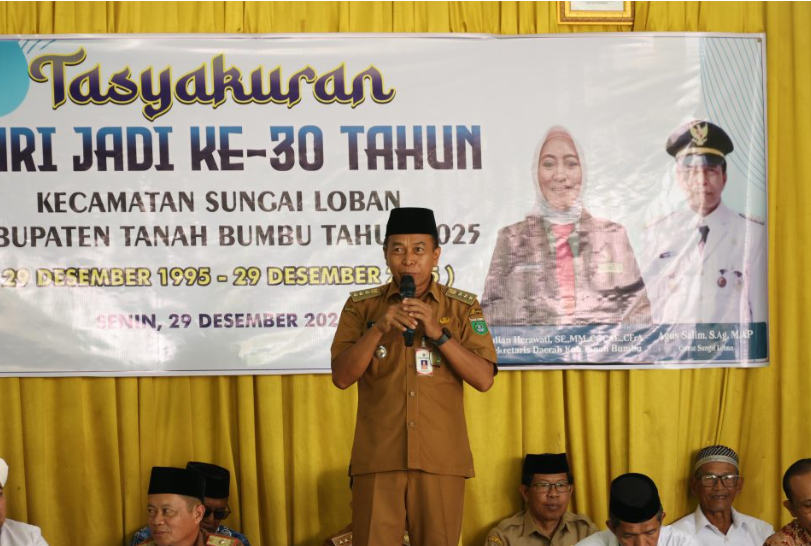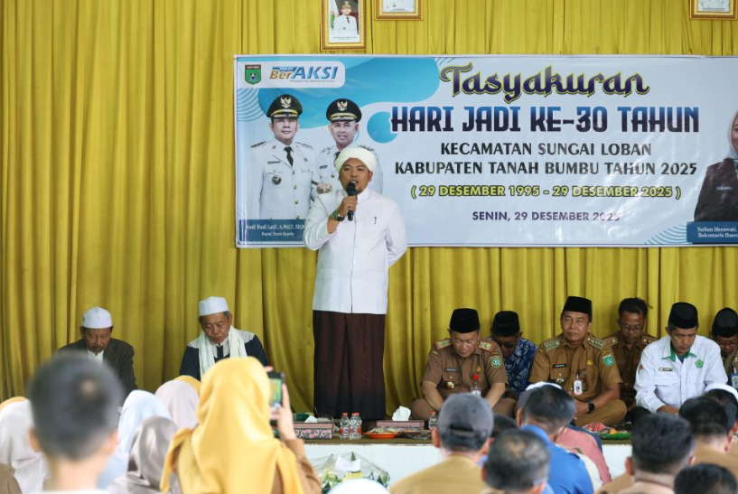 BATULICIN – Pemerintah Kecamatan Sungai Loban, Kabupaten Tanah Bumbu, menggelar Tasyakuran Hari Jadi ke-30, Senin, (29/12/2025) bertempat di Aula Kantor Kecamatan Sungai Loban. Kegiatan berlangsung khidmat sebagai bentuk rasa syukur sekaligus refleksi perjalanan tiga dekade pembangunan wilayah.
